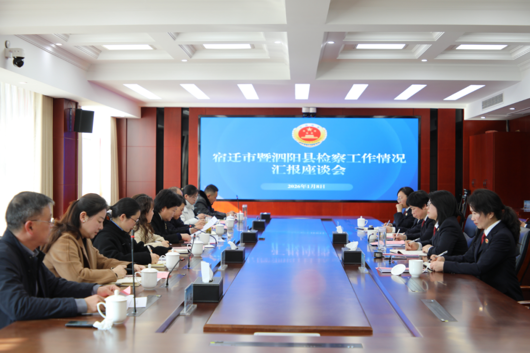 1月8日上午,宿迁市暨泗阳县检察工作情况汇报会在泗阳县检察院召开。宿迁市检察院党组成员、政治部主任李红阳向部分人大代表、政协委员汇报2025年全市检察工作情况。泗阳县人大常委会副主任王朝霞主持汇报会。泗阳县检察院党组书记、检察长周玉,泗阳县人大常委会内司工委副主任陈坚,市、县检察院有关领导参加汇报会。